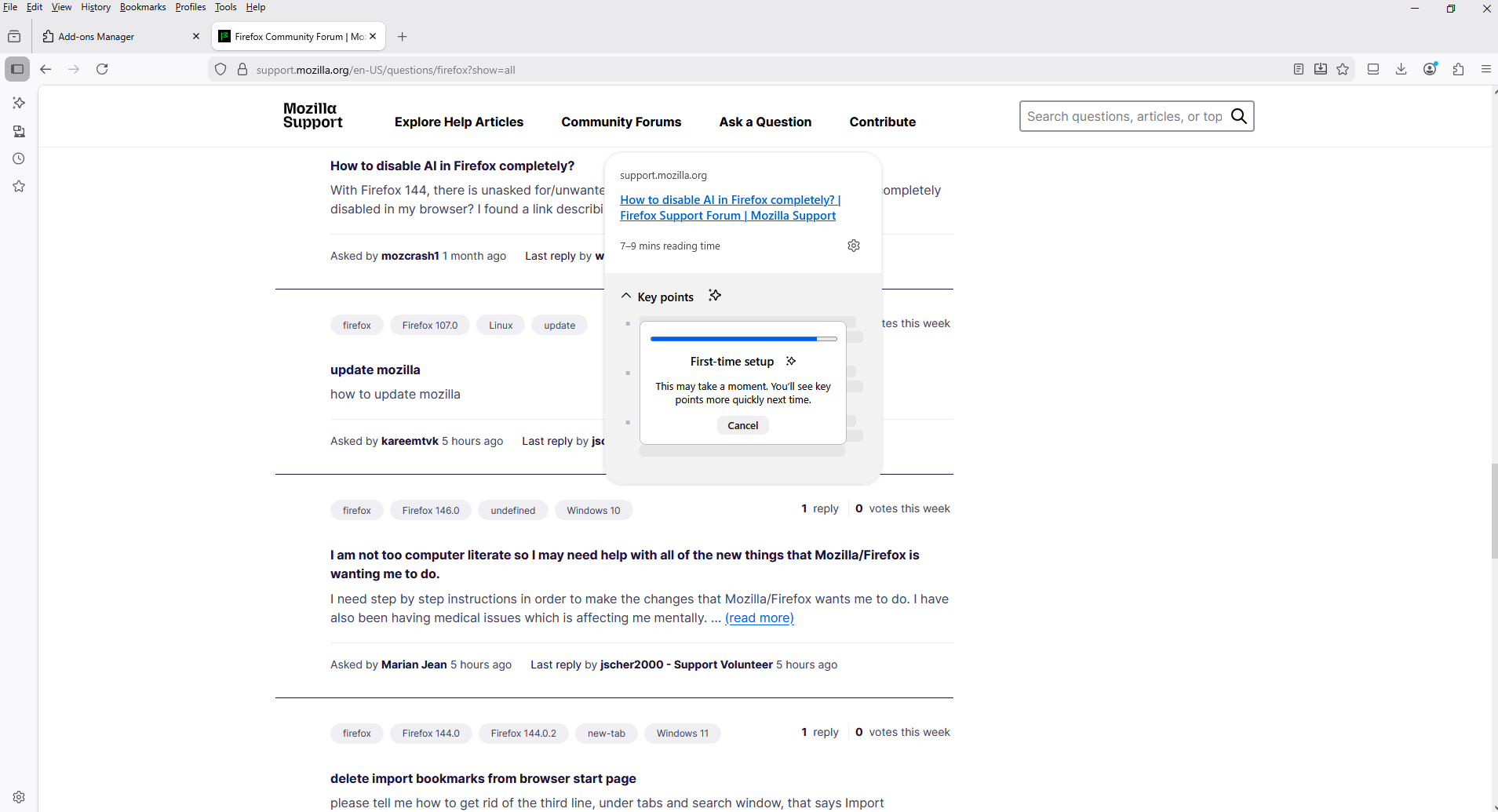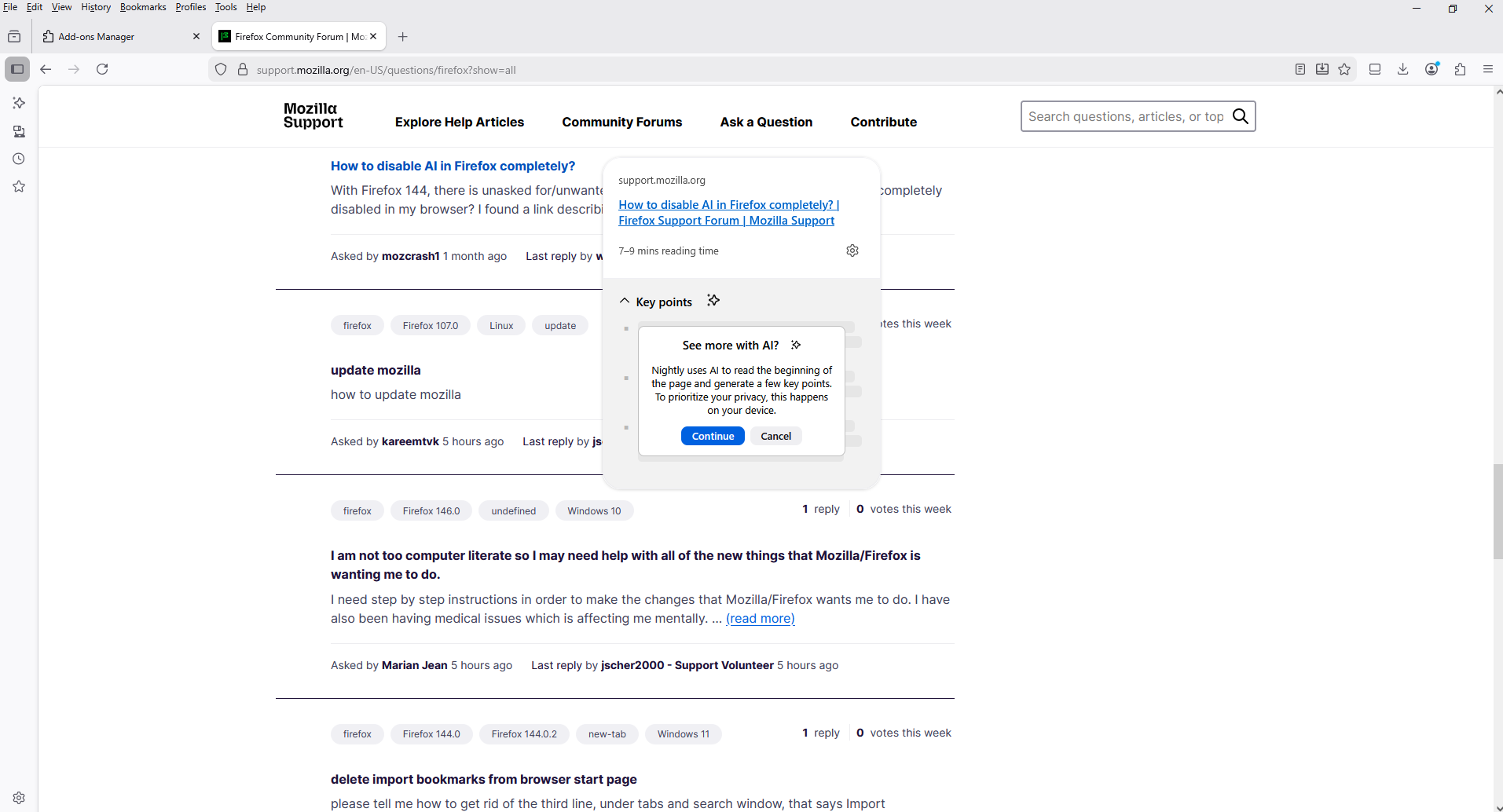With Firefox 144, there is unasked for/unwanted AI introduced. How do I ensure that all AI is completely disabled in my browser? I found a link describing some settings, but want to confirm this will disable ALL AI in the browser. I don't want it, don't trust the privacy/security holes yet to be found and would prefer it was not included in Firefox to begin with. The list I've found is: