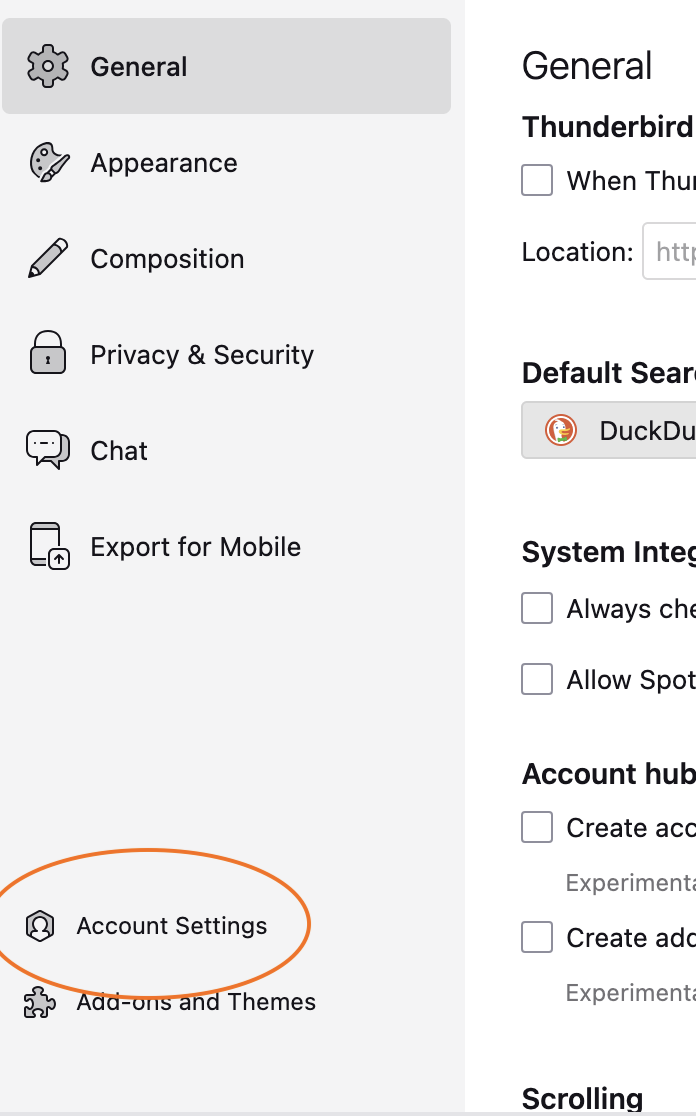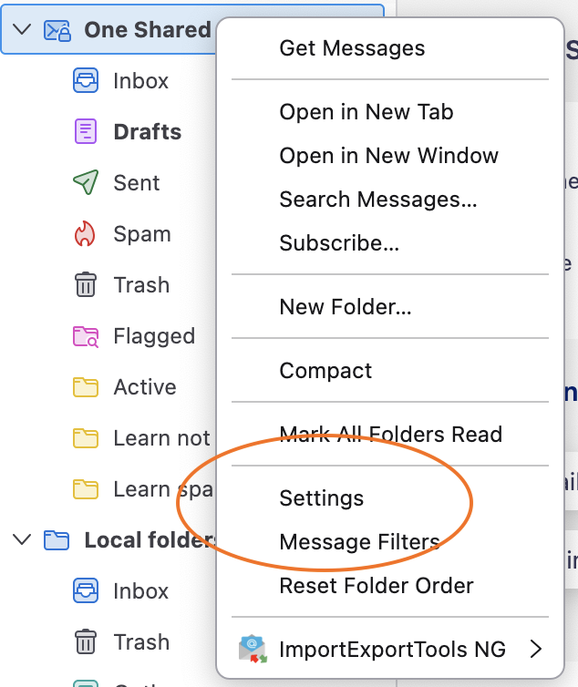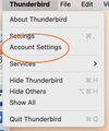 Denne indstilling er til anvendelsesindstillinger. Klik på kontoindstillinger. Fulgte du ikke mine anvisninger om at bruge knappen med de tre streger og klikke på "Kontoindstillinger"? Du kan også højreklikke på kontonavnet i mappepanelet og vælge "Indstillinger".