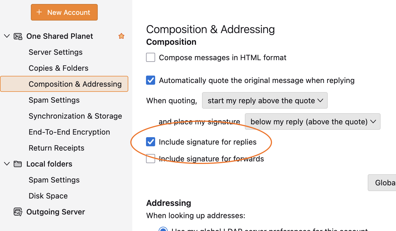 SUGGESTION Account settings > Composition & addressing > Include signature for replies