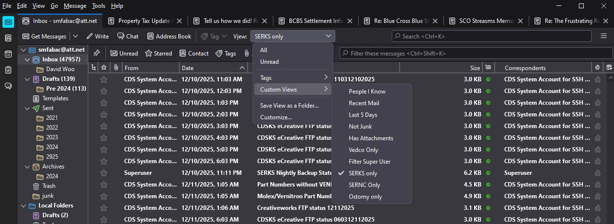 I have resisted automatic update of Thunderbird using "check but notify me." For whatever reason on 11/27/2025 Thunderbird was updated to 115.10.1 and it was an unsatisfactory change. Two thing immediately got by attention: 1) the menu bar had been changed and all open tabs had been removed. And 2) I could not find anyway to customize views (see the uploaded image). After two days of fighting this change trying to re-enable custom views, I preserved my mail folders then uninstalled Thunderbird 64-bit and restored Thunderbird 32-bit from an image backup of C:\Program Files (x86)\Mozilla Thunderbird. That of-course required me to set up my profile again and copy the saved mail folders to the new profile directory tree. I don't like automatic closing of tabs in 115.10.1 and for that alone would not upgrade beyond what I'm now running. And I can't work without setting up custom views to show messages automatically sent by my UNIX client's nightly backup process. My default view is to "Filter Super User" as all automatic client backup reports come from the root (superuser) account. The 115.10.1 had some type of filtering named "Quick View" (This is from my memory as I can't consult a running 115.10.1 installation) that is inadequate as it did not offer a way to save the views for later use (that I could find in my frantic state).