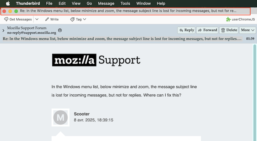 In the Thunderbird windows menu list, below minimize and zoom, the message subject line is lost (says "Mozilla Thunderbird" only) for incoming messages, but not for replies. Where can I fix this? --- Using Thunderbird Desktop Version 128.8.1esr on MacBook Air M2 with MacOS Monterey 12.5