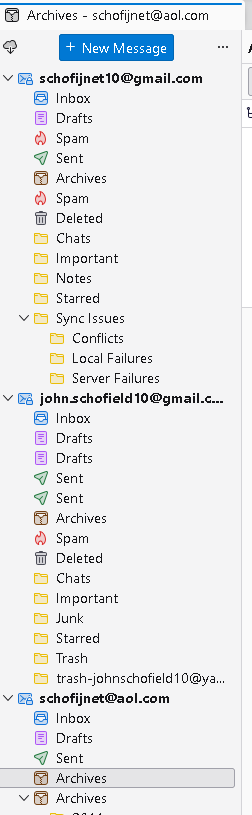 I have three accounts set up in Thunderbird and my "ALL MAIL" folder has disappeared from my GMAIL ACCOUNTS. I did however appear to have 2 x Archive folders but in schofijnet10 one has disappeared in john.schofield10 i have 2 x DRAFT Folders and 2 x Sent folders in schofijnetQaol I have 2 x ARCHIVE and 2 x SPAM Folders Please see the image