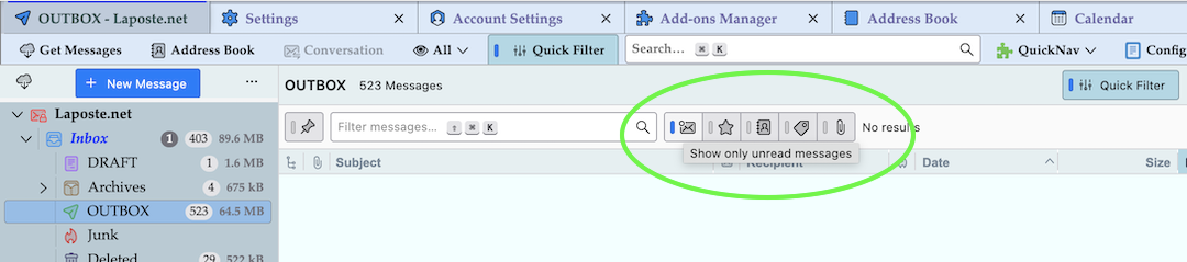 I doesn't matter what I do with the Quick Filter bar, none of the 12 messages appear. All of the other folders are working fine.
