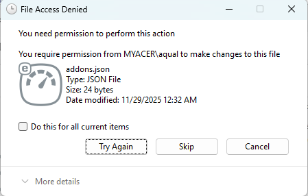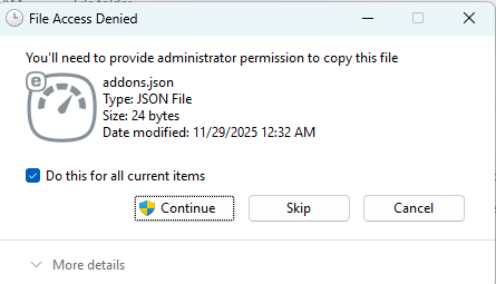 1, I'm running windows in an administrator account. I don't have an issue copying other files besides Firefox. That tells me it's likely a Firefox issue. 2. Use the elevated command prompt? What is that and how is it accomplished? 3. Set permissions? What permissions and where? And since I used to copy Firefox Profile folders without a problem, why do I have to set permissions? May I ask for an easy method to copy Profile folders. Also, it would be nice if someone offered to help me recover years of important tabs and bookmarks lost due to this issue. When I tried to copy Profile folders recently and had this issue, trying to resolve it messed up my computer to the point that I had to reinstall the operating system.