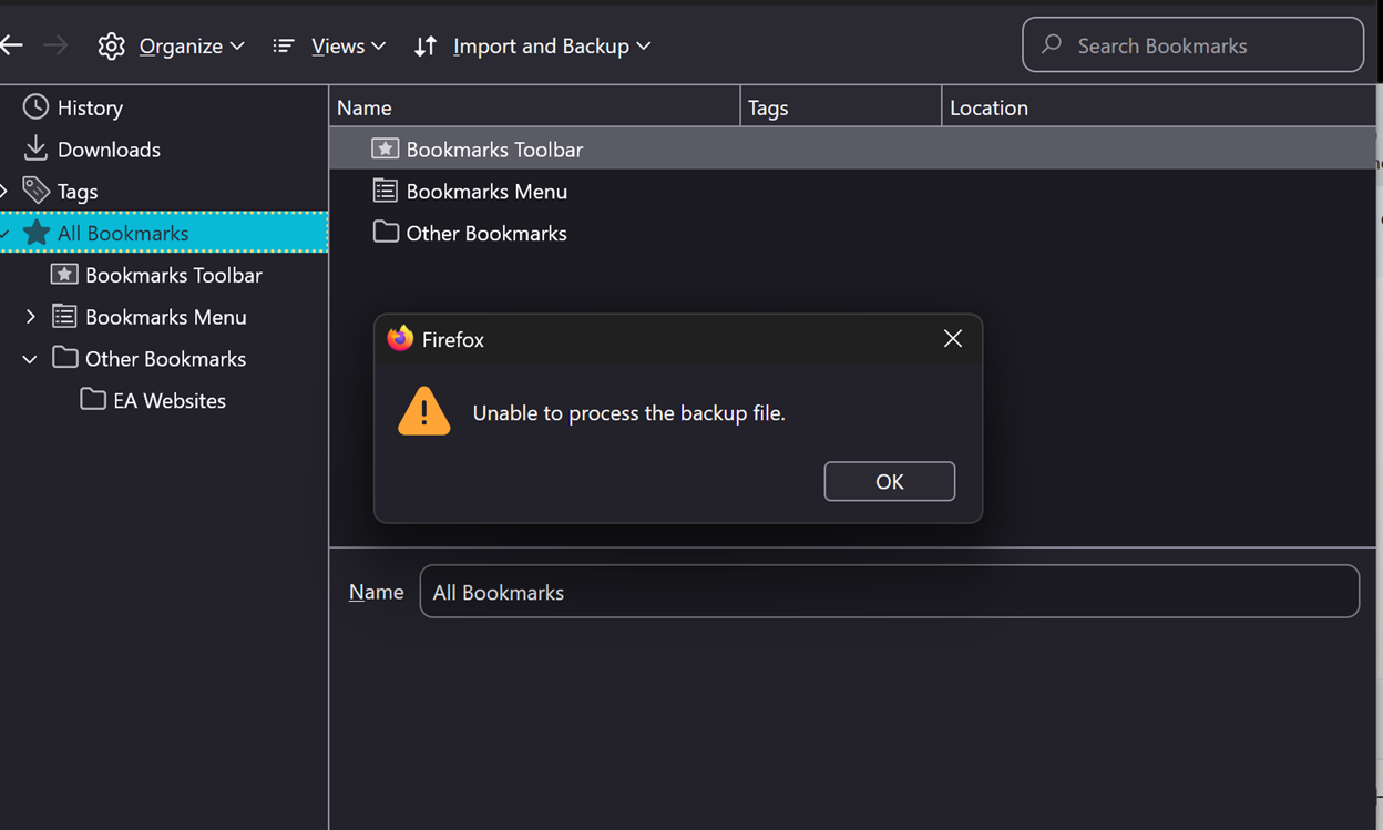 All of my bookmarks disappeared. I have followed all the step to restore from the profile folder and to restore manually. It works to a point, then I get an error message saying Firefox is unable to process the backup file (see attached image). I even tried it in Troubleshooting mode.